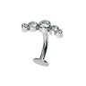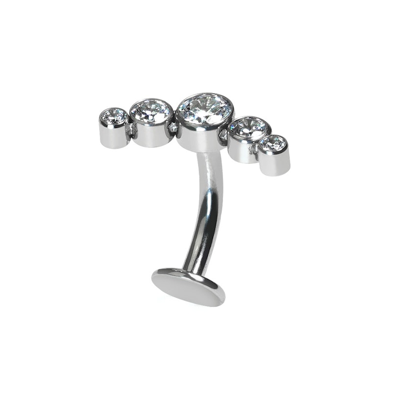 Táto titánová otočená činka do pupka má päť kryštálov, ktoré sú lunetovo osadené. Keďže je vyrobená z titánu, je hypoalergénna a vodoodolná. Tento šperk sa uzatvára pomocou push-in mechanizmu, čo znamená, že na jeho upevnenie v piercingu stačí top mierne ohnúť a zasunúť ho do tyčinky.