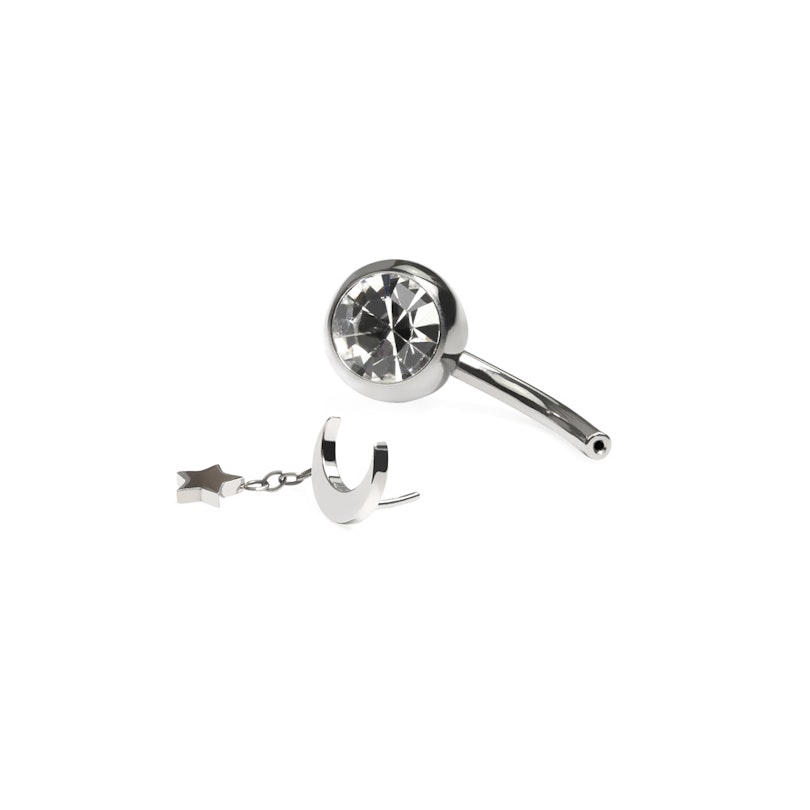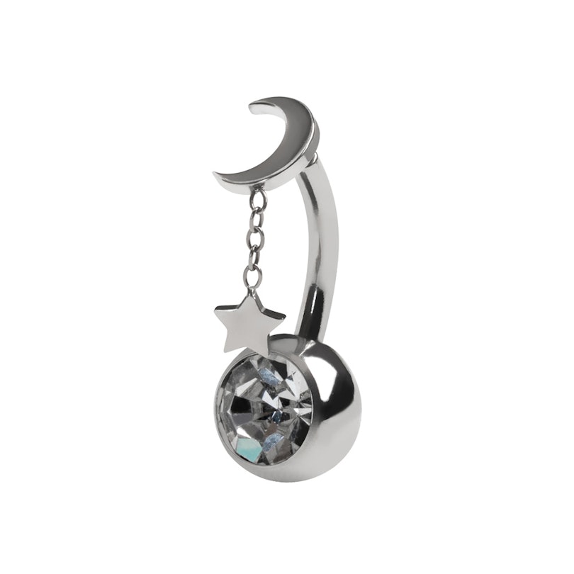 This titanium belly ring features a moon with a star charm on the top part, which when inserted will give the "floating" look. The bottom ball features a bezel set CZ stone for extra sparkle.