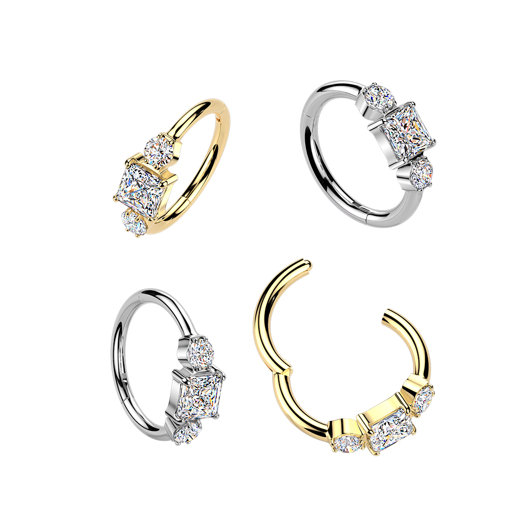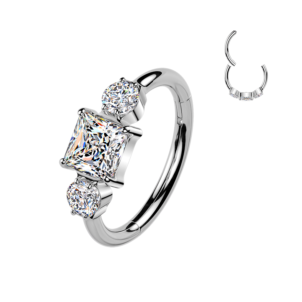 Three stones, one big flex. This Bodymod Premium titanium hinged ring with three CZ stones gives your piercing just the right glow. Subtle enough for everyday, shiny enough to turn heads.