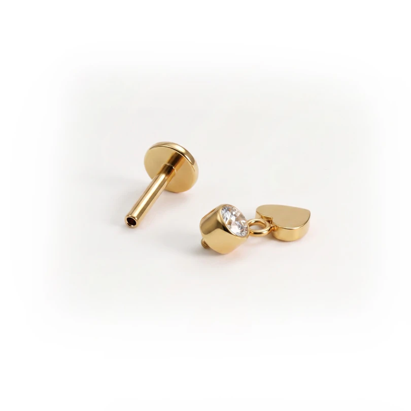The titanium labret with heart dangle keeps things simple at first glance, then adds a small detail that shifts the whole look. A bezel-set stone sits at the top, while a heart-shaped charm hangs just below, adding a gentle sense of movement. It’s the kind of piece that's easy to style on its own or alongside other piercing jewelry. Available in gold and silver colors.