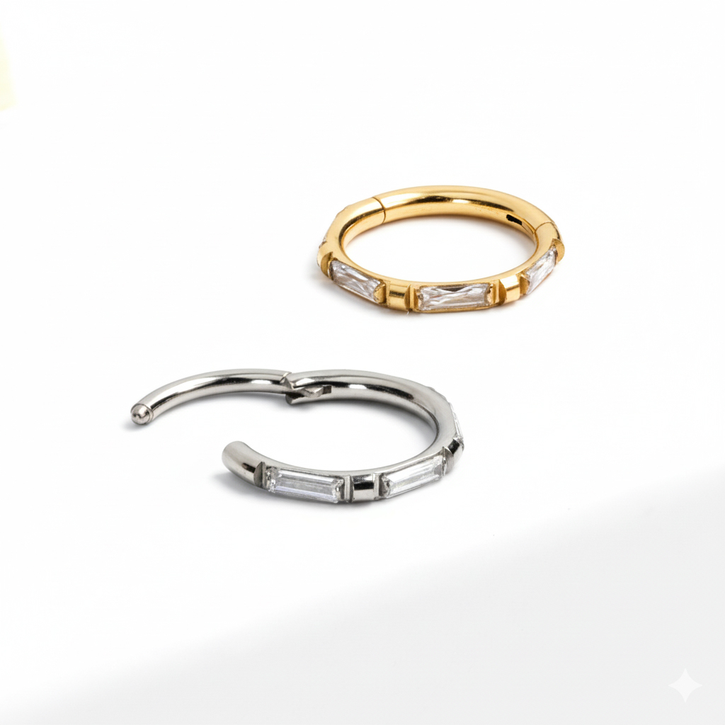 This titanium ring with baguette-cut stones has a stylish design of alternating baguette-cut rectangular CZ stones and tiny squares of metal on the outside of the ring. As it is a hinged ring, it is easy to secure and insert into your piercing. Being crafted from titanium ensures that this piece is hypoallergenic, durable, and waterproof.