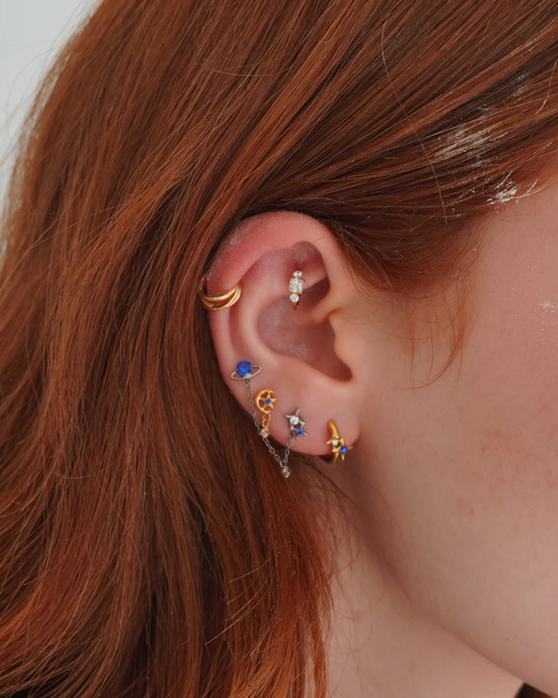 The titanium space labret duo plays with connection and movement. One labret features a small planet shape, while the other is detailed with tiny stars, linked together by a fine chain with a small stone hanging at the center. Clear and blue cubic zirconia stones add subtle contrast, keeping the look light and a little cosmic without going over the top. Finished in silver color, it's made to be worn as a pair.