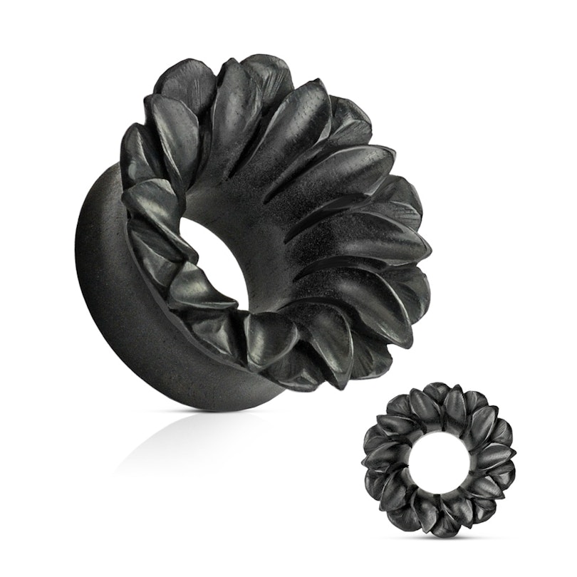 This black tunnel with a flower on the front side is made of organic wood, which adapts to your body excellently. It's carved in the shape of a lotus flower, a beautiful design for your earlobe.