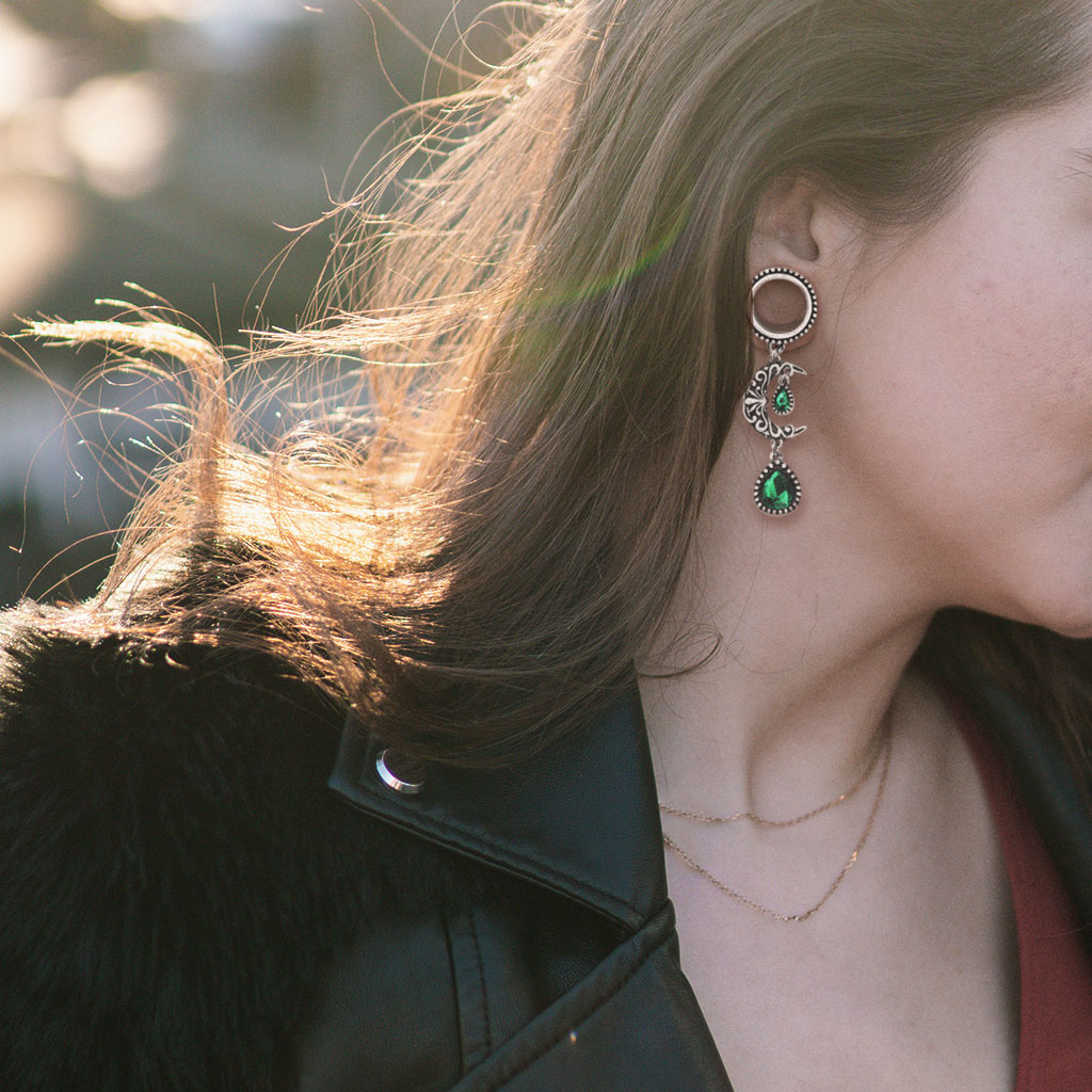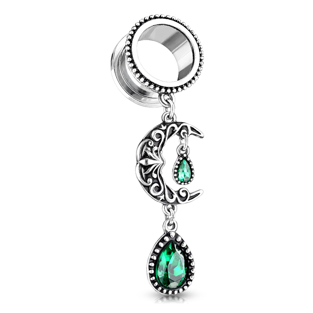 Tunnel with filigree moon and green stones dangle