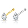This small and sweet nose stud is made of 14-karat gold. The bar has a length of 1/4" (6 mm) and has a stone on top. The stone has the shape of a drop, or a teardrop, held by a four-prong setting. On the opposite end of the bar, there's a small ball that keeps the stud in place. It's small enough to push it into the piercing but big enough to prevent it from slipping out.