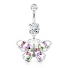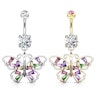 Imagine the beautiful butterfly you see in the picture in your belly. This beautiful butterfly has two wings full of tiny stones in different colors. The stones are round and conical shaped, providing a perfect combination. While the butterfly is crafted from brass, the belly ring is completely coated in your choice of color: plated in gold or rhodium for the silver model. The bezel-set stone on the top varies according to the model you choose. As you can see in the picture, it's pink in the golden version, and transparent if you select the silver model.