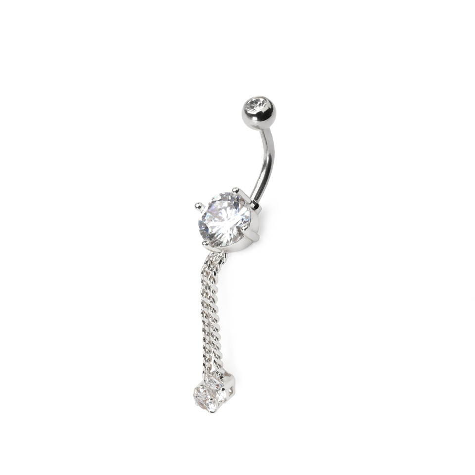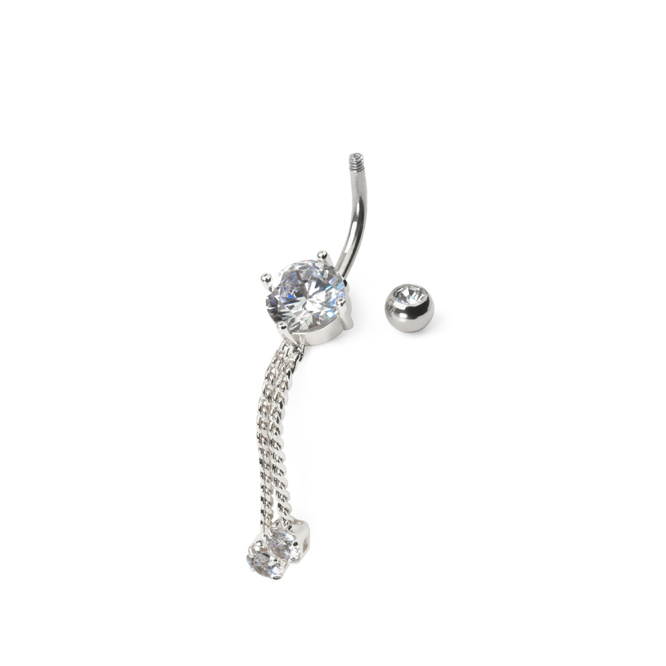 This beautiful belly ring is a true statement piece. The chain dangles finished with small stones add a touch of elegance and movement, making this belly ring truly unique. Being made from surgical steel ensures durability and comfort. The bar is 10 mm long with a thread thickness of 1.6 mm. The chains drop 28 mm from the main stone. Available in a choice of gold, silver, and rose gold finishes with clear stones. This belly button ring is the perfect accessory for adding sparkle to your look.