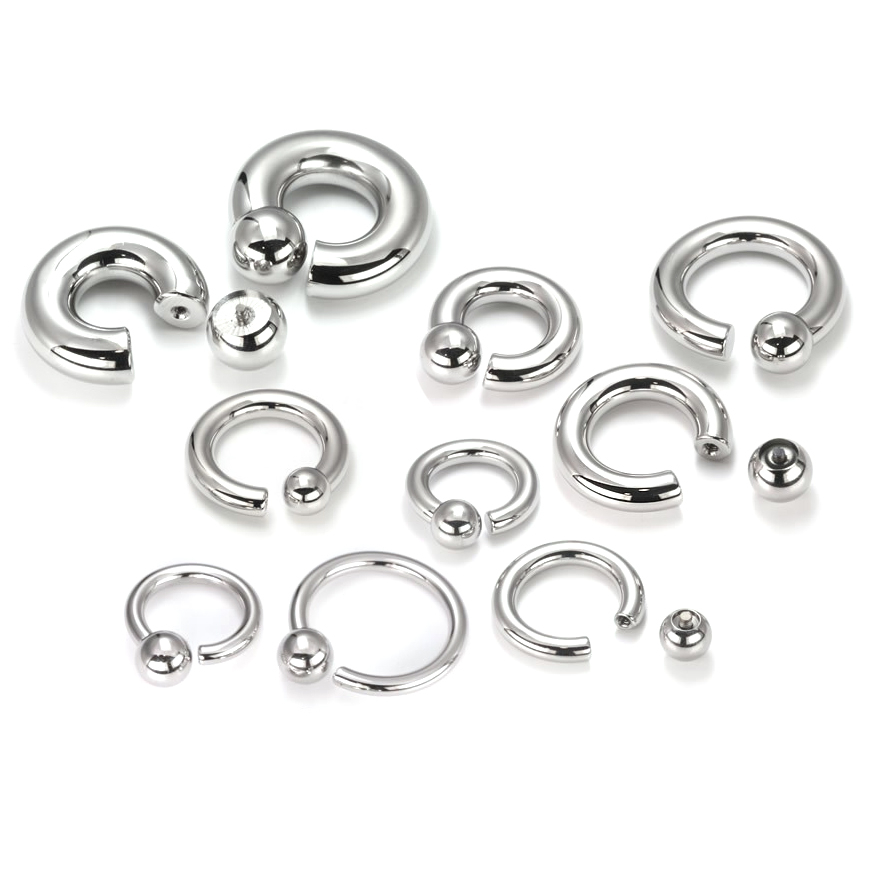We introduce the ultimate in large piercing jewelry. You can now get your extra-large captive bead ring with the handiest ball. As you may know, captive bead rings in large sizes are usually hard to open and close. But when you try this one, you will find it incredibly easy. This ring, instead of a captive ball between the two ends, has a threaded ball that is screwed onto one end.