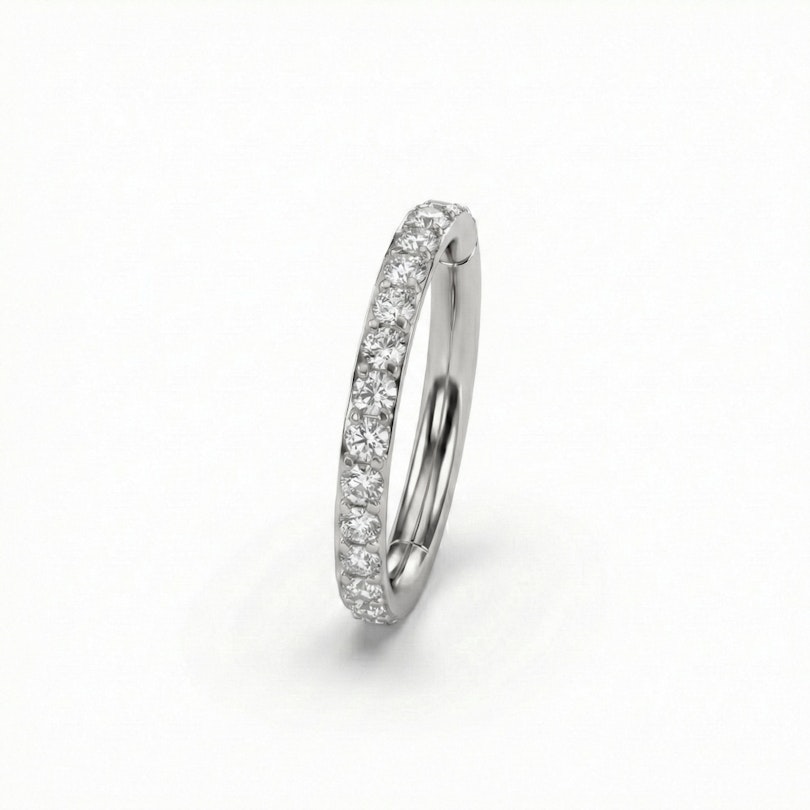 The ring is made of surgical steel, the material many prefer because of its price and durability. It weighs a little more than titanium, for example, but is in turn easier to work with. This ring is equipped with a hinge that will allow you to easily open and close it. A small segment of the ring is attached to one side, which can be pulled up to open and pushed down to close. This way, you won't have any loose parts that can get lost if you drop them down the drain.