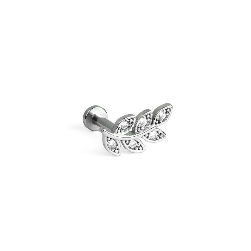 The leaf is ideally shaped for ear piercings with its curved design and sparkling cubic zirconia stones. The leaf design size is 4.8 x 9.5 mm, and the thread thickness is 1.2 mm. You could use it in your helix, tragus, conch, or lobe, for example. This piece comes in two length options; 6 mm or 8 mm, so you can get a snug fit for your piercing.