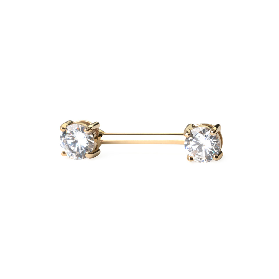 This fabulous nipple barbell is available in two different colors. The classic yellow gold model makes a beautiful contrast with the stone's white color, and white gold will give your look so much style.