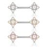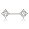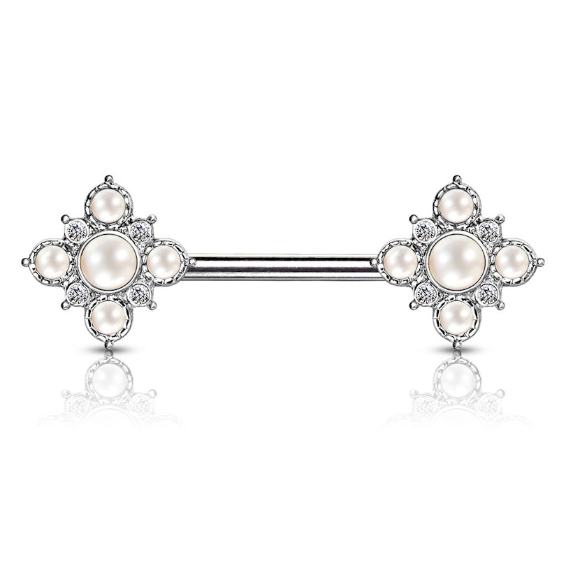 The barbell you can see above is for you if you have a nipple piercing - or both nipples pierced. The item consists of a bar in surgical steel with a length of approximately 1/2" (12 mm) between the flowers. Whether they are flowers or not, we leave it up to you, but with a little imagination, you can see a big pearl as the center of a flower and four smaller pearls as the petals. Between them, four tiny crystals add a beautiful touch to the whole item.