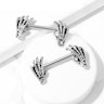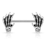 If you put on this nipple barbell in your piercing, you will have a skeleton hand on each side of your nipple. The hands are connected by a surgical steel bar with a gauge of 14g (1.6 mm). The distance between the hands is approximately 1/2" (12 mm).