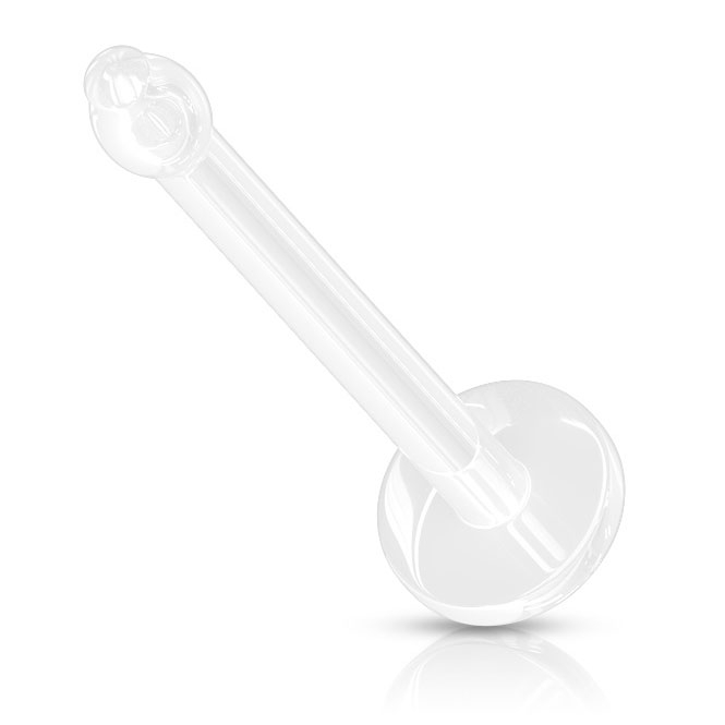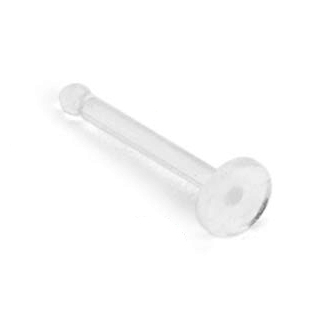 This nose piercing retainer is made of transparent plastic or Bioflex, and it consists of a single bar with a gauge of 20 (0.8 mm) and a length of about 1/4" (7 mm). It has a small ball on one edge, slightly thicker than the bar. This works as a stop, so it will not get out of the nose if used normally. On the other edge, it has a plate with a diameter of 1/16" (2 mm), which should be placed inside the nose.