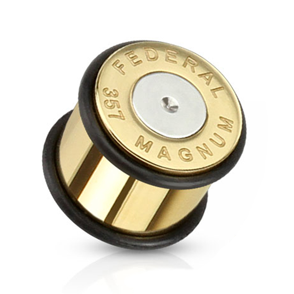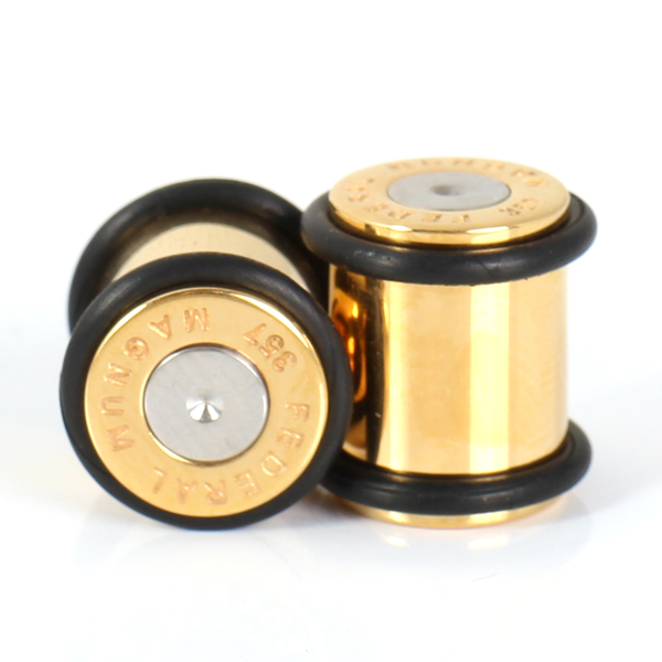 This item is made of surgical steel and comes with a gold plating that makes the plug look like a cartridge case. It comes with two o-rings that will secure it n your earlobe gauge.