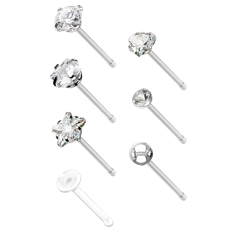 Do you need a different nose stud every day? In that case, this fabulous set of 7 nose studs is perfect for you. Each stud has a different design, but they're all elegant and simple, perfect for every occasion. It also includes a retainer for your nose piercing, perfect for the situations in which you need to hide your piercing. And if you need something more exclusive, you can choose a heart- or star-shaped piercing. Other designs in the set are half ball and square. You have many different possibilities to choose from.