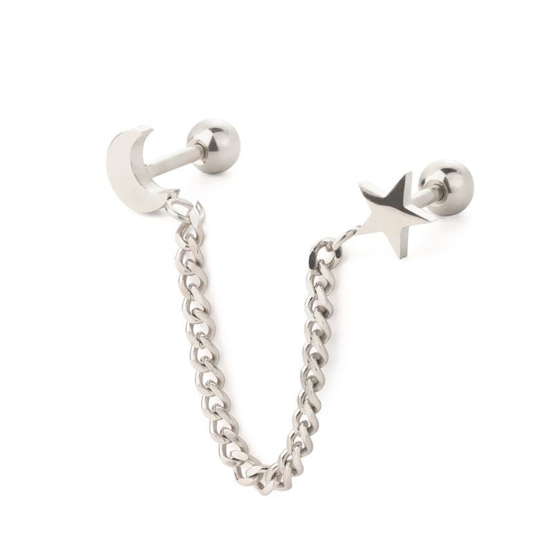 The jewelry consists of two barbells connected by a chain. Each bar is 16g (1.2 mm) thick and 1/4" (6 mm) long. They have a 5/32" (4 mm) locking ball on the back. On the front, they have a star and a crescent, respectively.
