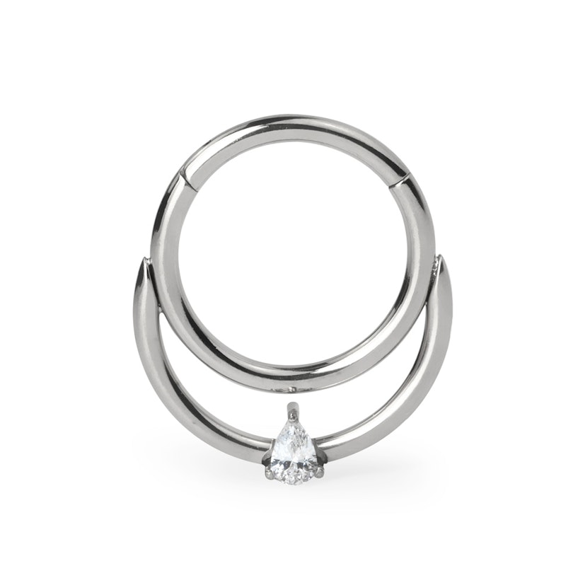 Titanium-hinged segment ring with teardrop stone balanced in 2 hoops. This beautiful piece transcends elegance with a tear-drop shaped stone that interconnects the 2 rings to create a signature piece. It is available in both gold and silver colors. The jewelry has a thread thickness of 1.2 mm and comes in 8 mm and 10 mm ring diameters, making this piece perfect for a helix, a daith, or a septum piercing.