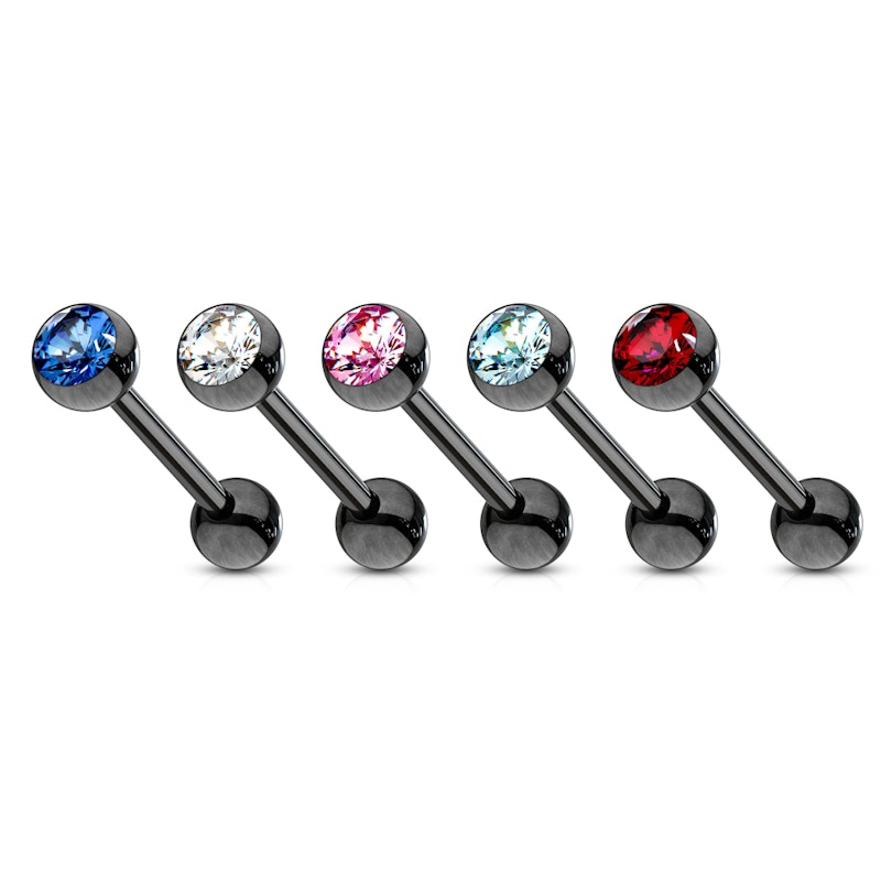 Tongue barbell in black color with colored gem