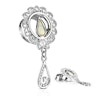 The tunnel features two drops: one hangs freely below the tunnel, while the other is stuck inside it, which is the one that has a mother of pearl inlay. The frame is a wreath of quirky arms that form a beautiful filigree pattern.