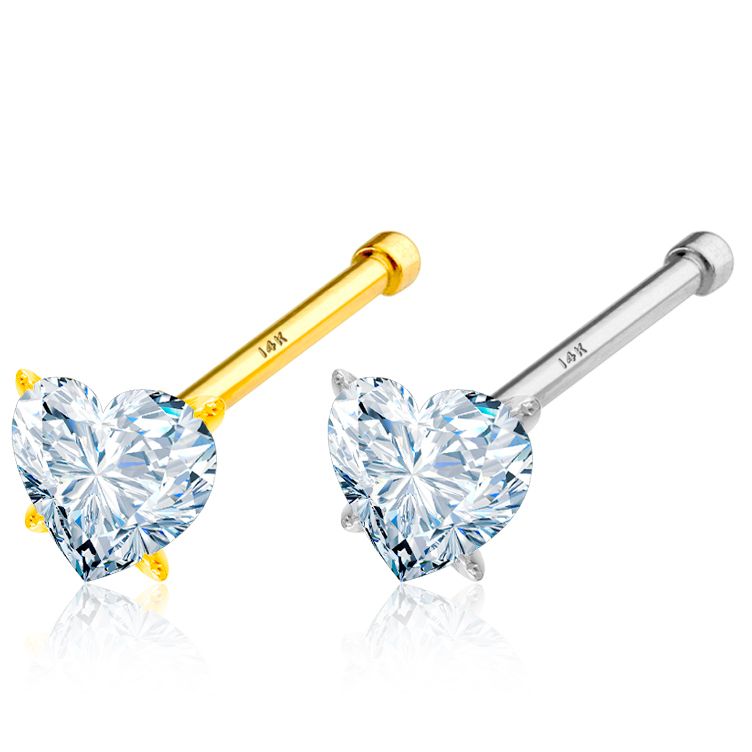 This nose stud is available in two different gold types: 14-karat yellow gold and 14-karat white gold. Apart from the material, they're 100% identical. Both have a stud with a length of approximately 1/4" (6 mm) and a gauge of 20g (0.8 mm), with a rounded end that ensures the stud won't slip out.