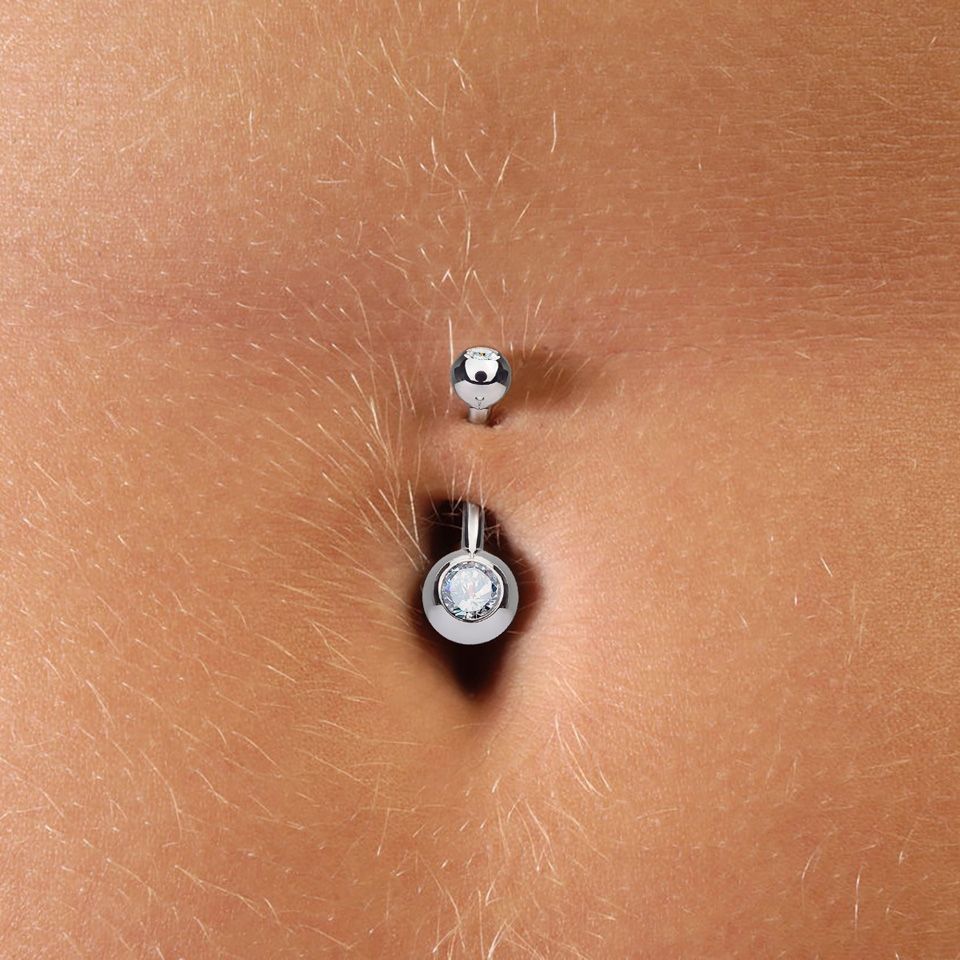 It features a regular curved barbell with a bezel-set crystal stone on the bottom and top balls. However, the top crystal stone faces upward, while the one on the bottom is in the center of the ball.
