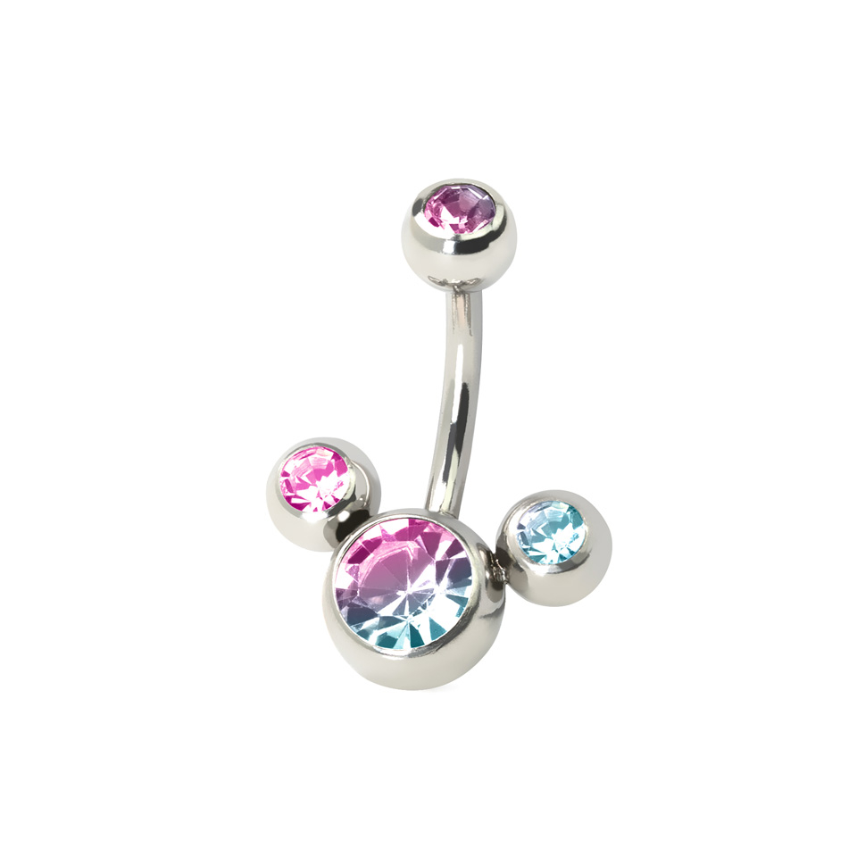 This belly button ring has a shape that everybody knows, at the end of a curved barbell of 3/8" (10 mm) and a top and bottom ball. The difference is that this barbell has two balls connected to the bottom ball. Besides, each ball has a colored stone, in beautiful colors you can choose from.