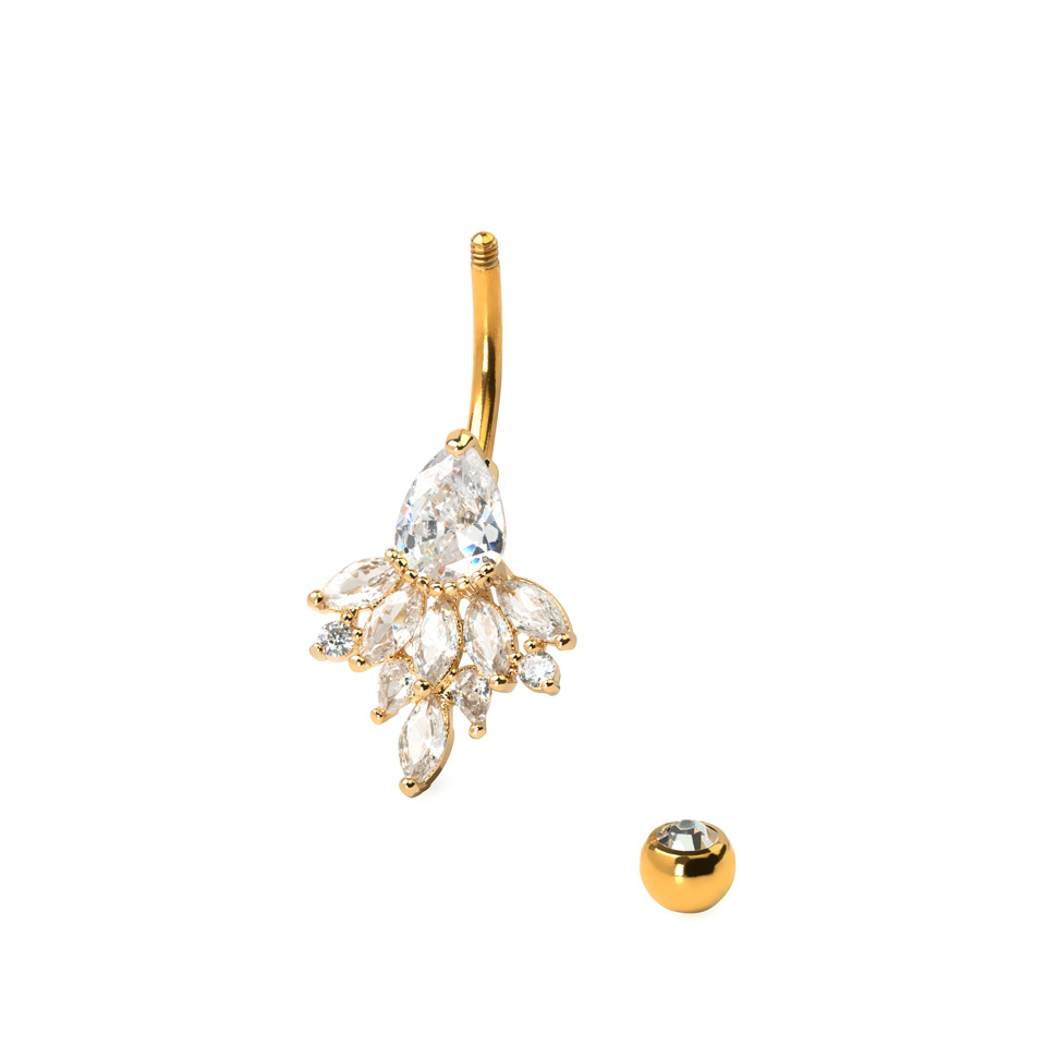 This belly button ring is simply gorgeous. To start with, it has a curved barbell of 3/8" (10 mm) in length and a top ball with a white stone. But if you look closer, you will see that it has several oblong stones fixed in a bigger drop-shaped stone. All of them are diamond faceted, so light reflects on them from different angles. The stones under it are distributed in three rows, and a single oblong stone hangs at the bottom end.