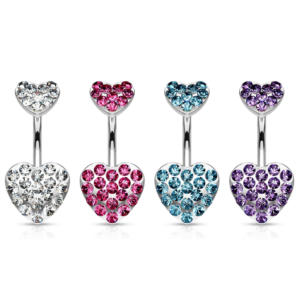 It's made of surgical steel and has a barbell length of 3/8" (10 mm). Instead of the classic top and bottom balls, it has two beautiful hearts studded with lots of stones, which is the feature that stands out the most. These tiny stones resemble diamond cuts which allow light to reflect on them from many different angles. You can choose between five different models for this belly ring, all of them in spectacular colors.