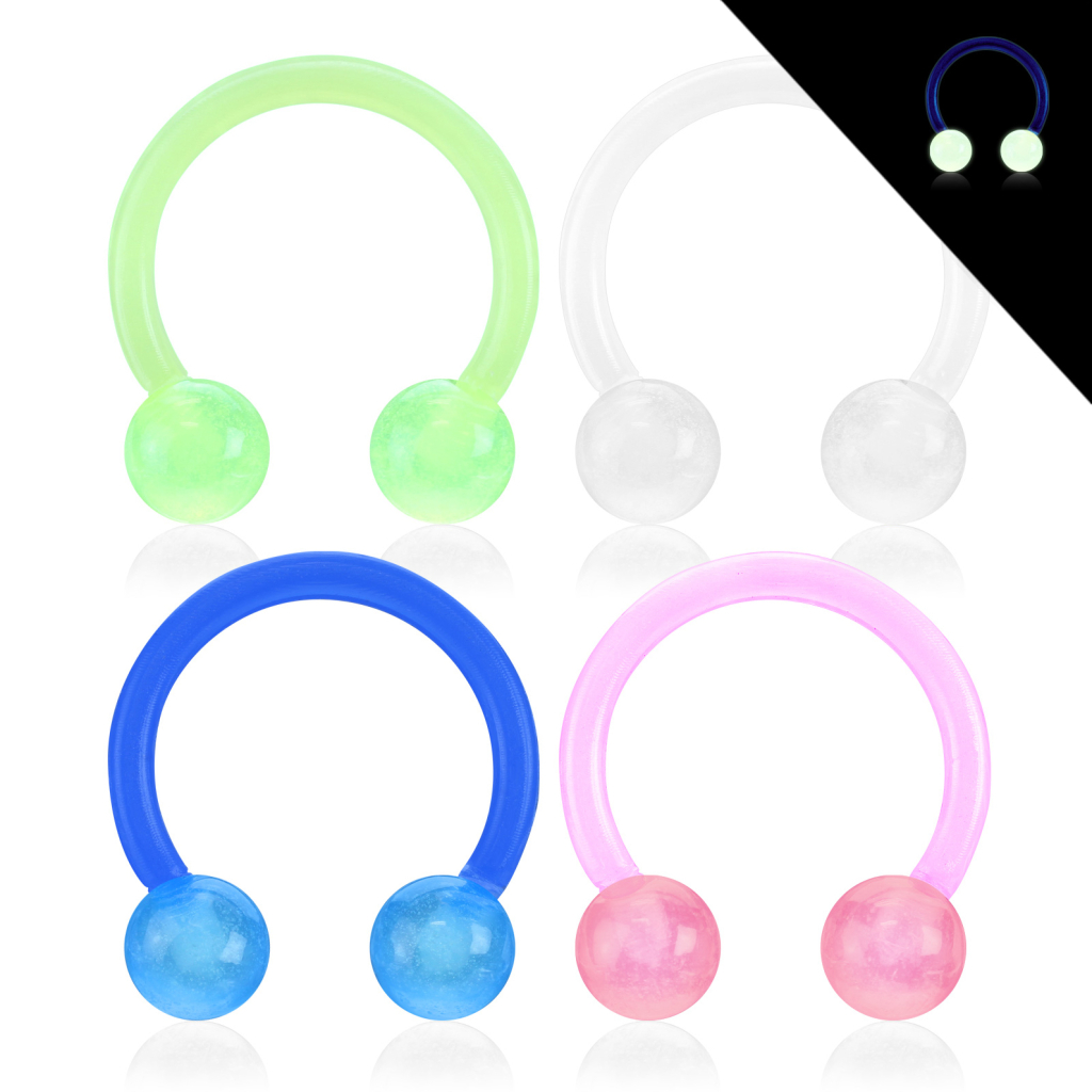 If you turn off the light, this barbell glows in the dark. It's a glow-in-the-dark circular barbell made of acrylic. During the day and with natural light, this barbell looks normal; the difference is that you will see it glow when it's dark. That's why it's an excellent ring to go out to party at night. Besides, you can wear circular barbells in many different piercings, provided that you choose the correct size for yours. You can put it in your septum, eyebrow, or ear piercings, for example.