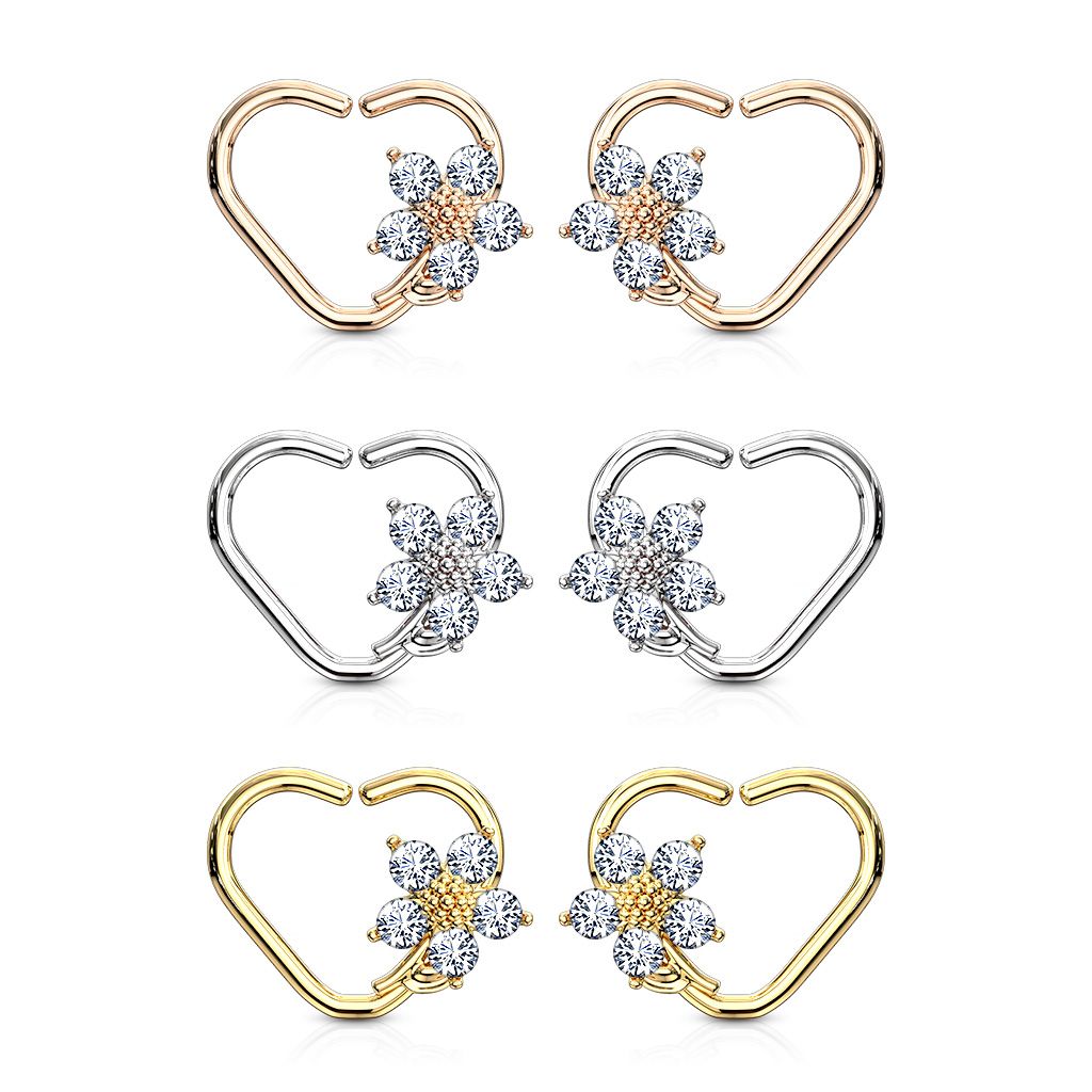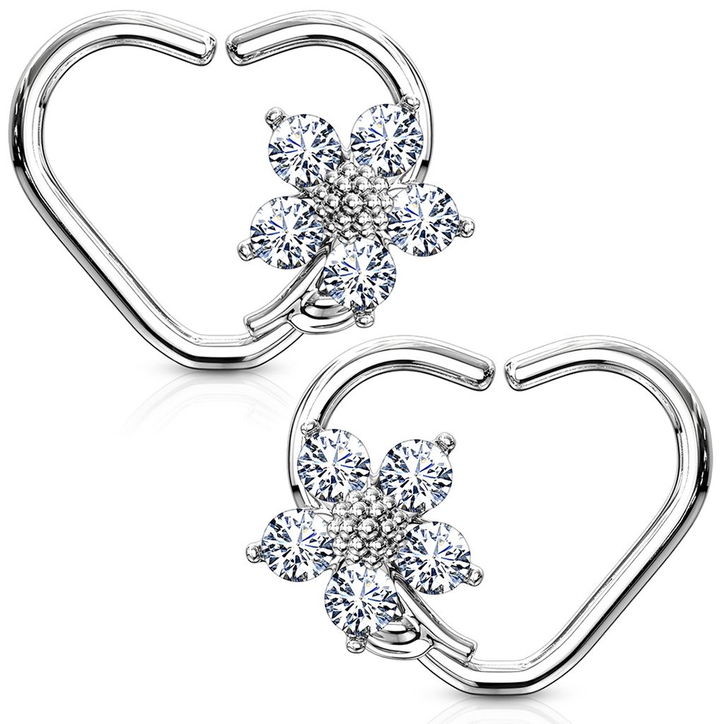 Hearts and flowers - you can’t possibly get anything more beautiful and feminine. This piece of jewelry features both. In the picture above, you can see a heart-shaped ear piercing and a flower charm studded with cubic zirconia stones. Since the flower is featured only on one side, you must decide what ear you want to wear it in. To do so, click on the right of the picture and select the side you want the flower charm to be.