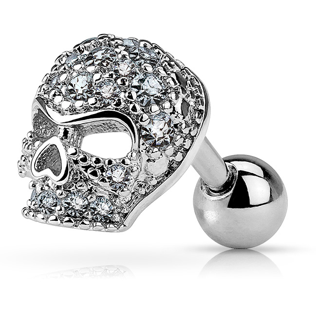 This incredible skull is set on a stud that is 1/4" (6 mm) long and has a threaded 5/32" (4 mm) end ball. You can use this stud in most piercings made with a needle, such as the tragus, helix, or earlobe piercing. Wherever you place it, this item will give you and your ear a rocker look.