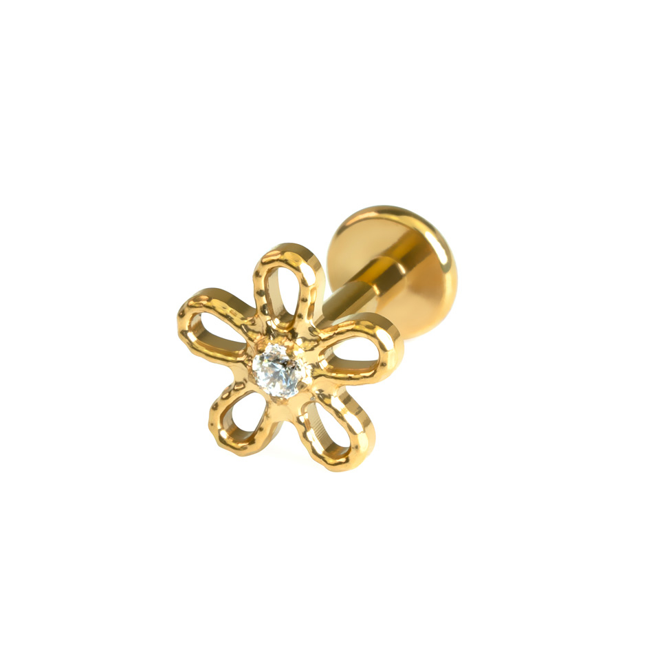 Our delightful daisy shaped labret features a central CZ stone for a touch of sparkle. With an internally threaded stem, it’s easy to wear — simply slide the smooth bar through your piercing and twist on the top to secure it. Made from hypoallergenic titanium, it’s ideal for sensitive skin. Available in gold or silver finishes, you can also choose the length that fits your piercing best. Add a cute touch to your look with this daisy design.
