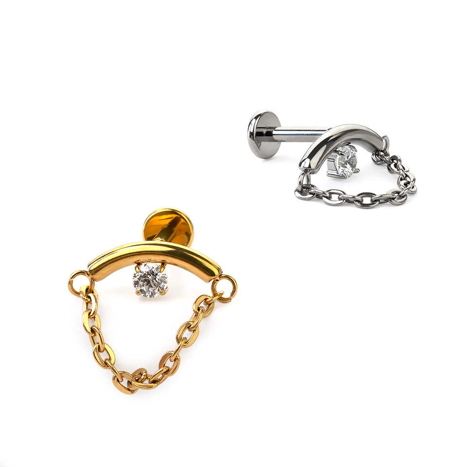 The design of this titanium labret features a curved bar with a chain that links both ends and loops underneath. There is a bezel set CZ stone in the centre of the bar. Wear this labret horizontally in your lobe, or in your helix where the curve will follow the contour of your ear.