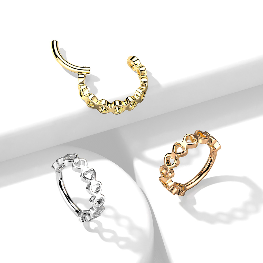 Showing all hearts, this ring brings a playful side to your piercings. The jewelry is made of surgical steel and is opened and closed using the hinge locking mechanism, which makes it perfect as an interchangeable piece. It has a thread thickness of 1.2 mm and comes in 2 sizes, 8 mm and 10 mm.