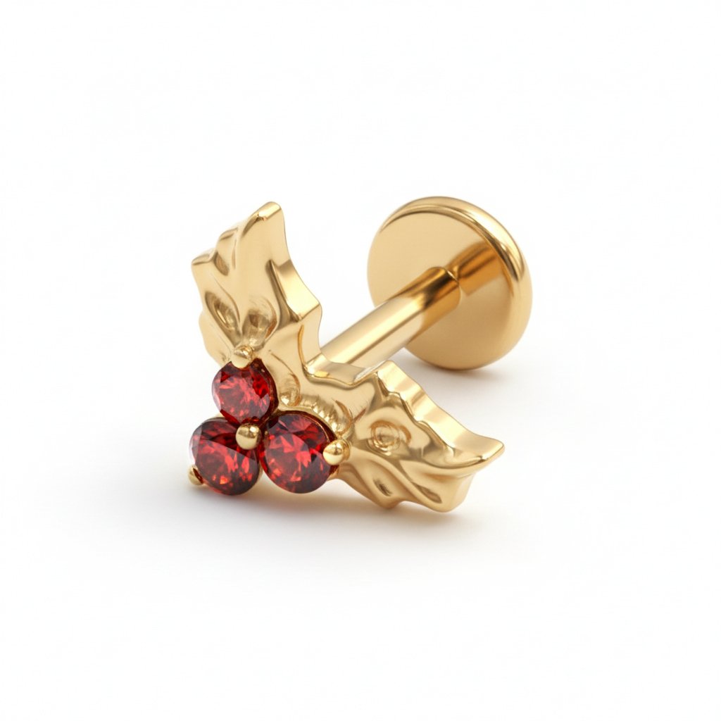 The holly labret in titanium proves you don’t need mistletoe to turn heads. Red stones and gold leaves come together in a design that feels timeless, playful, and just a bit flirty.