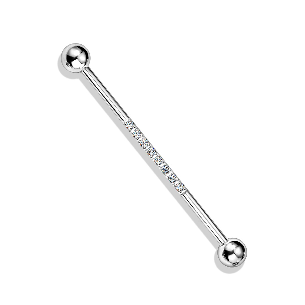 If you have an industrial piercing in your ear, we have a great piece of jewelry for you here. It consists of a straight barbell as you know it, with two balls -- one at each end. In the middle of the bar, there is a carved part with 8 small stones placed with an OCD perfectionist precision. The bar is made of surgical steel and available in several different colors, as well as with different stone colors. However, only the glossy silver-colored barbell is available with different stone colors. In other words, the colored barbells can only be selected with clear stones.