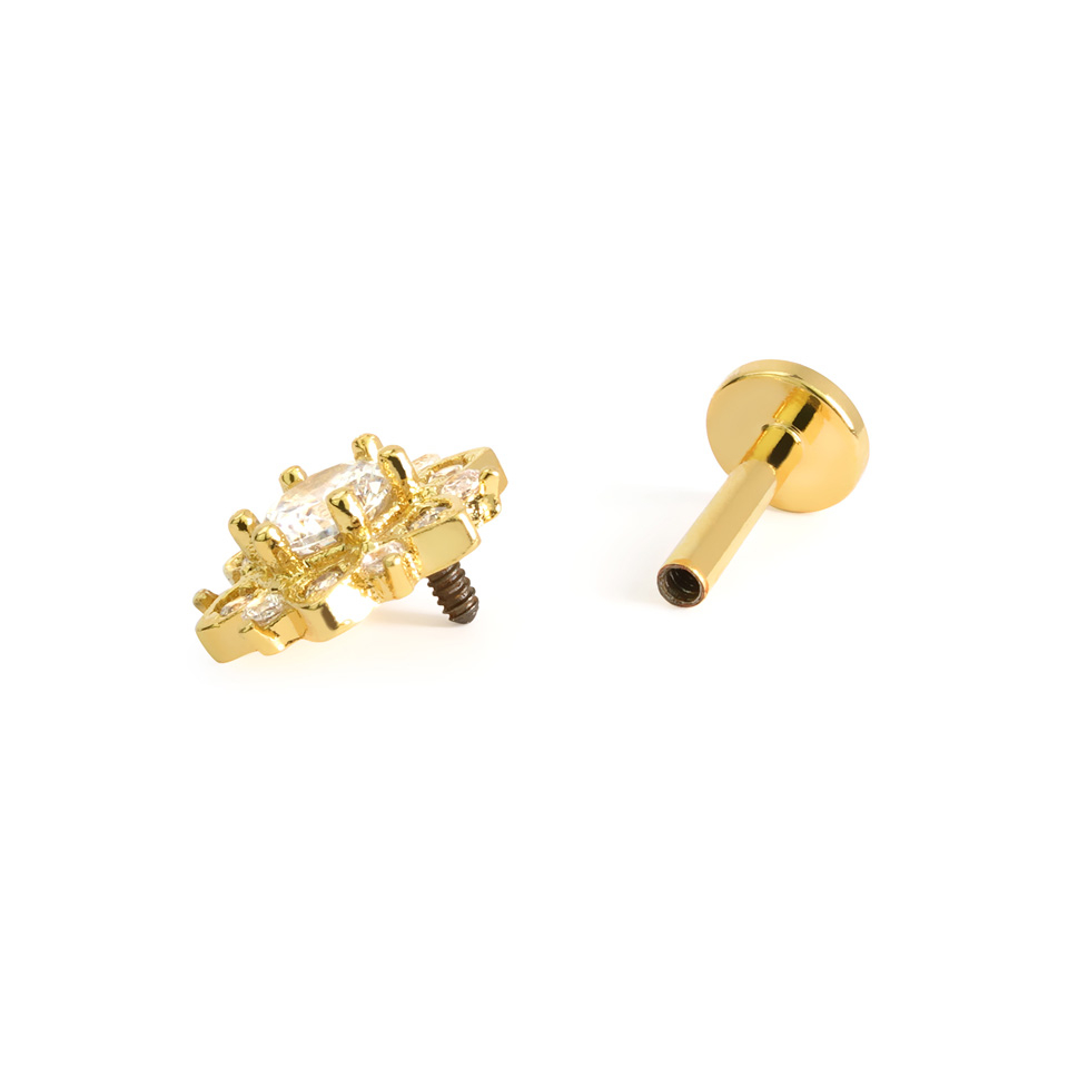 This labret is made of surgical steel. It's internally threaded, which means that the post has an internal thread. The top is equipped with a threaded rod that is screwed into the post, avoiding scraping the skin when you insert the labret into your piercing.