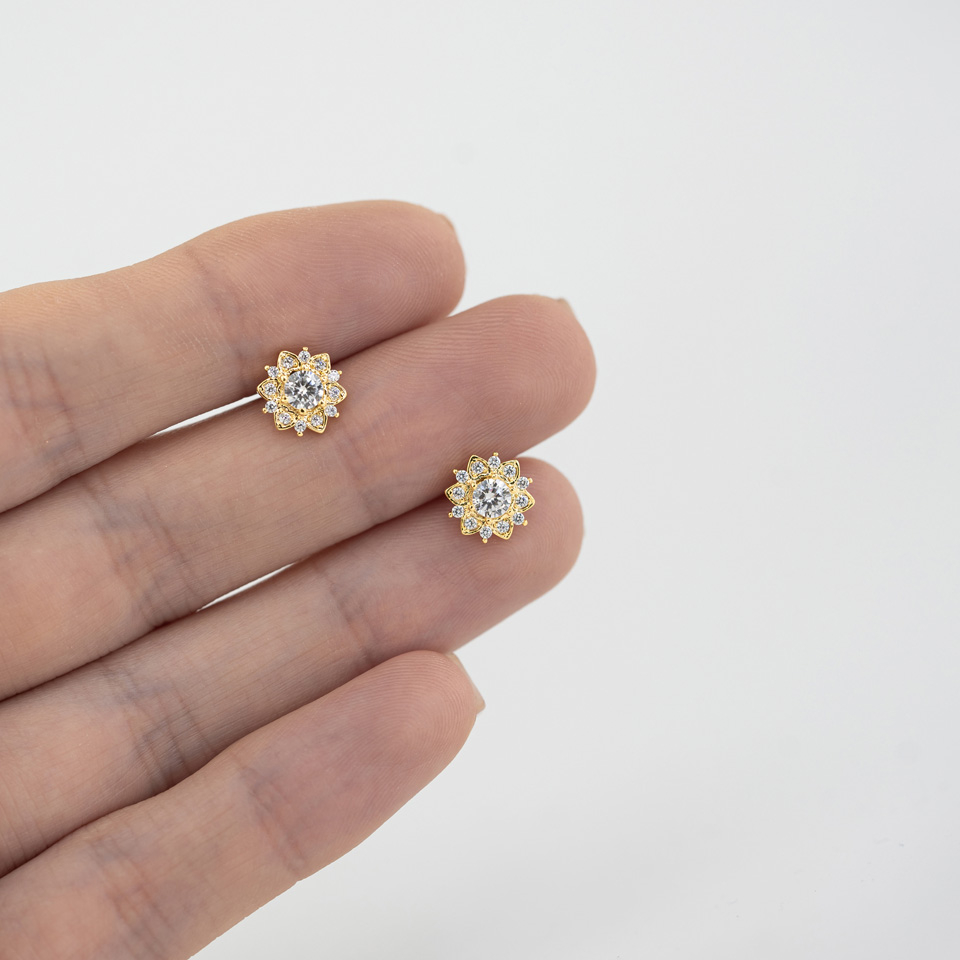 The top design features a beautiful lotus flower made of brass. The whole piece is coated in different color options of your choice: gold, rose gold, and silver. The lotus flower measures 8 mm in total and is studded with several tiny clear stones around the edge, and a faceted gem in the center. The gem measures 3.5 mm.