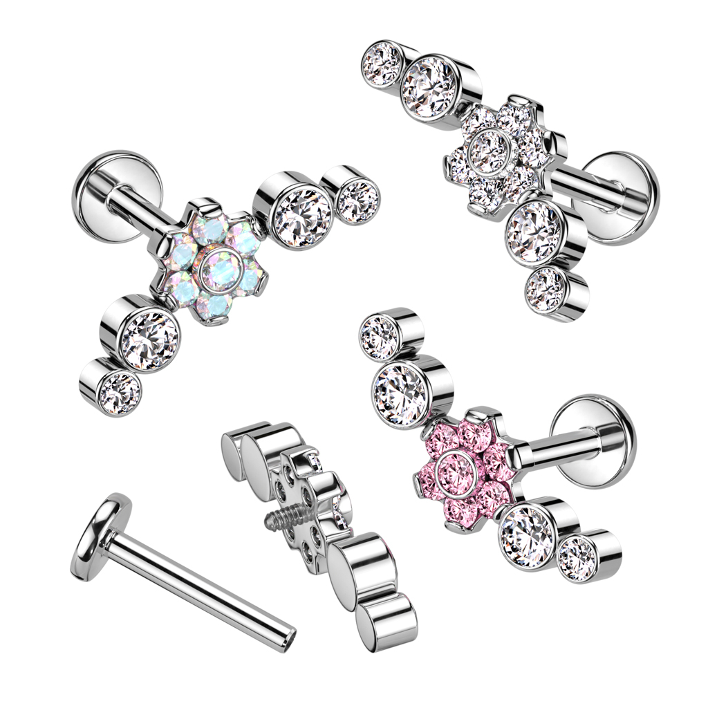 This labret is made of titanium, one of the most durable and highly recommended materials for piercing. It's internally threaded, meaning the post has an internal thread. The top is equipped with a threaded rod screwed into the post, avoiding scraping the skin when you insert the labret into your piercing.