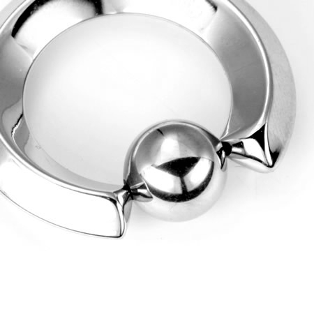 This captive bead ring opens and shuts with the ball, which is proportionally bigger in bigger size models. The ball has two small indentations in which the ring's ends are attached. In some models, the ball may rattle a little the first time, but once in place, it will not pop out.