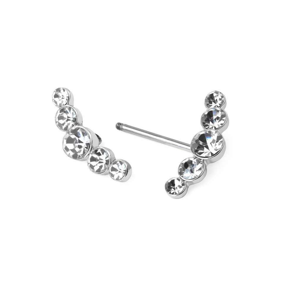 This nipple barbell consists of a straight bar and a vertical stone arch at each side. The stone in the middle is larger, while the other stones become gradually smaller towards the ends. The rows of stones are slightly curved, like arches that almost encircle the nipples.