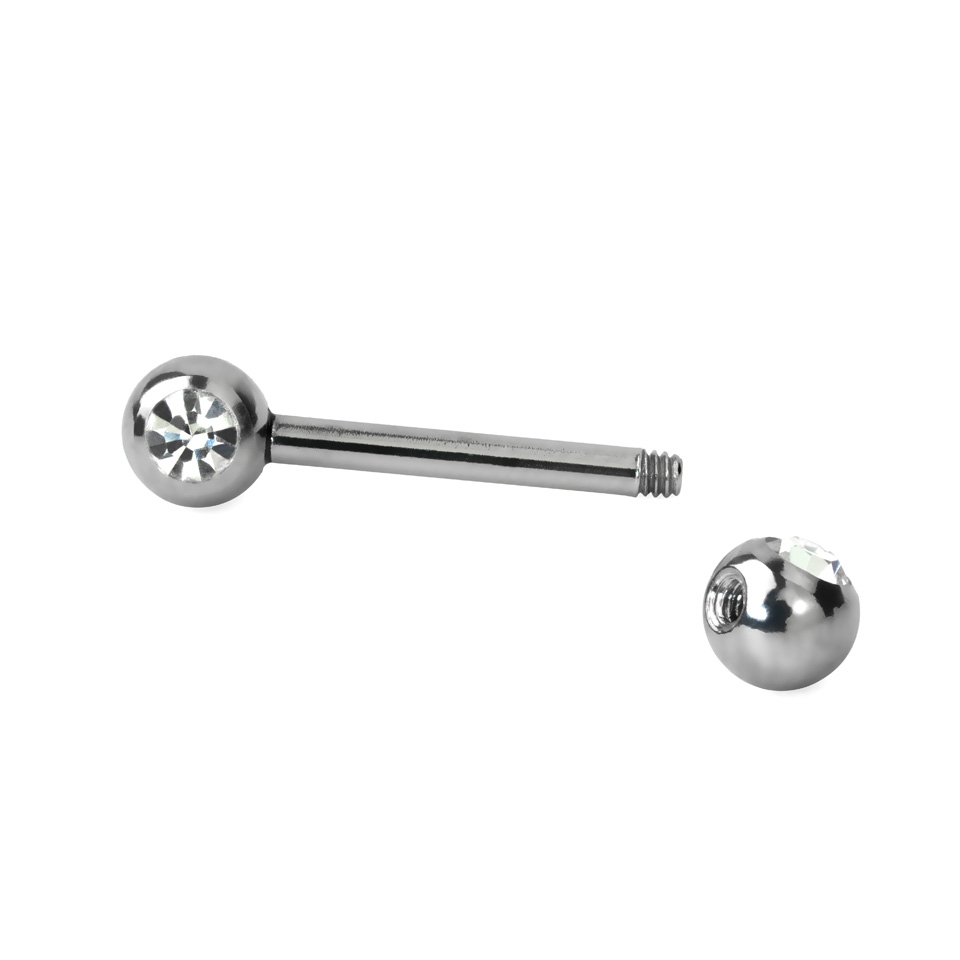 This nipple barbell has a simple design that consists of a bar with two balls, one on each end. Each ball has a bezel-set gem, and unlike other barbells, they look forward, as if they were eyes. It's a perfect barbell for the nipple piercing.