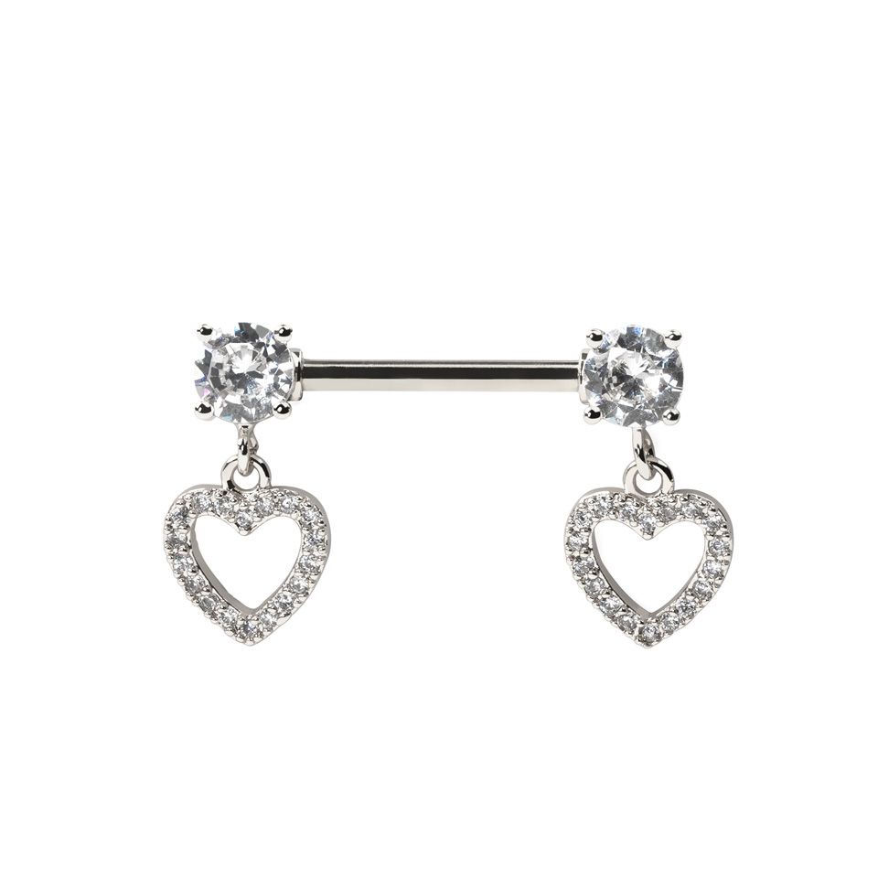 This beautiful nipple barbell features a CZ stone at each end, attached to which is a charming heart dangle studded with more tiny CZ stones.
