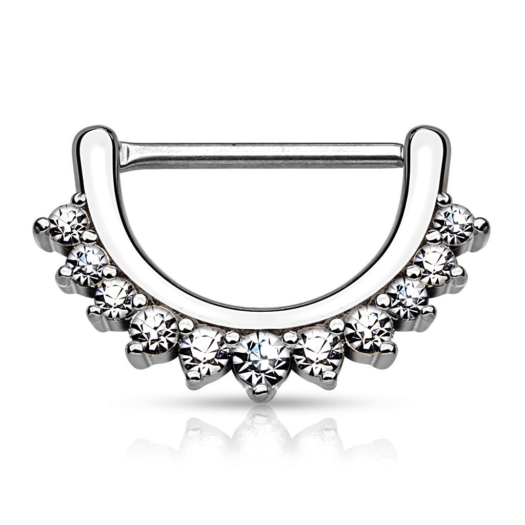 The jeweled edge has a row of white stones from the hinged segment to the other end. Once in place, it will sit under your nipple as a half-moon.