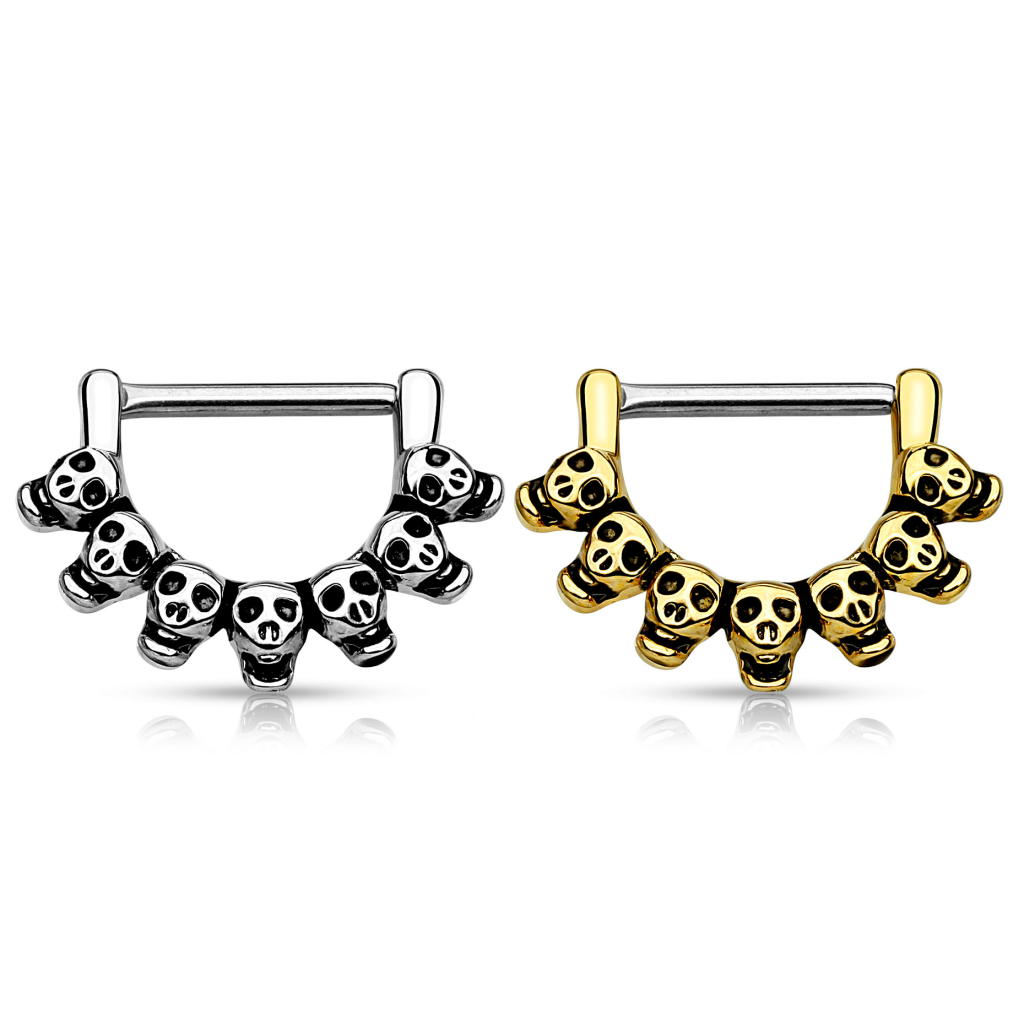The design reminds of the Mexican Day of the Dead, a fascinating holiday. The nipple clicker holds seven smiling skulls, one after another in symmetry, that will sit under your nipple. Get this fabulous jewelry in silver or golden, both with a contrast of darker hues.