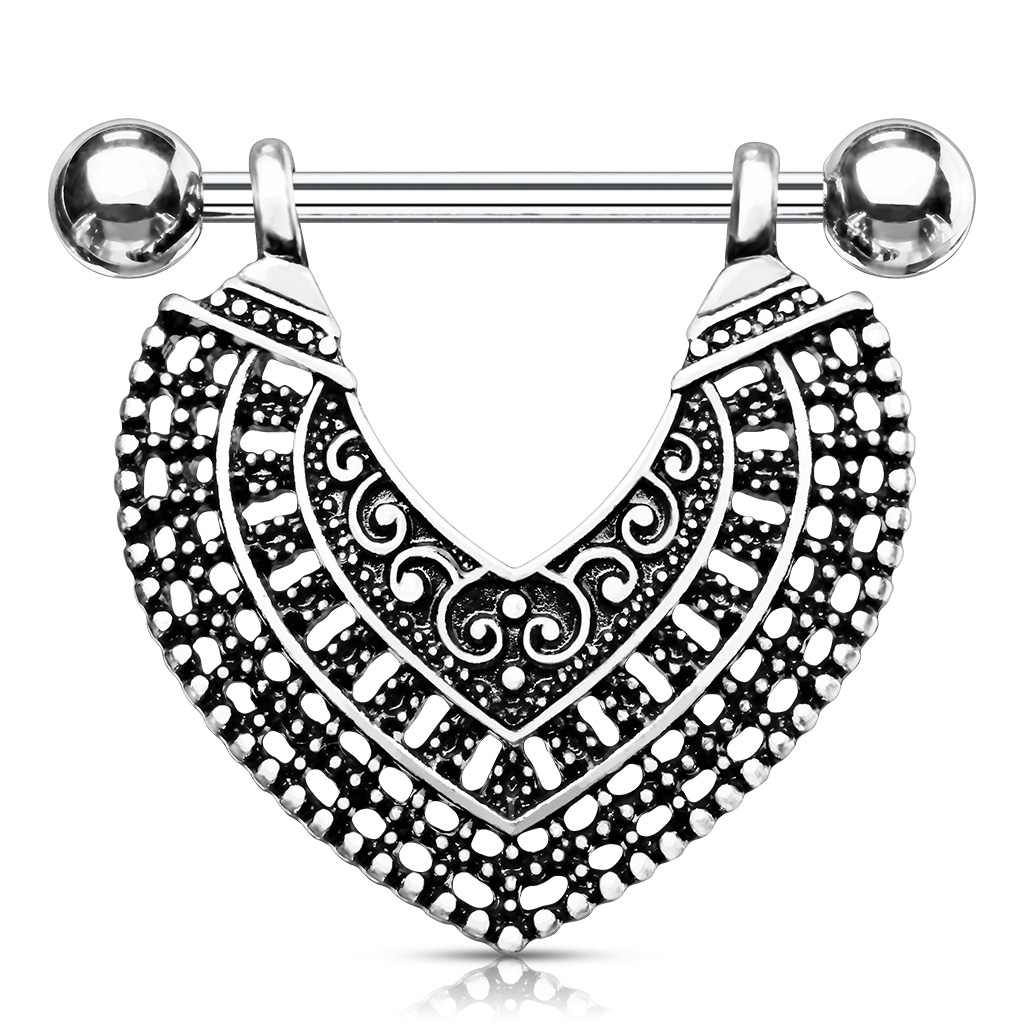 This nipple barbell is made of surgical steel, while the dangle is brass. The dangle and the end balls are layered with a silver or gold color finish, depending on the model you select. The dangle has beautiful shapes that remind of antique civilization decorations.