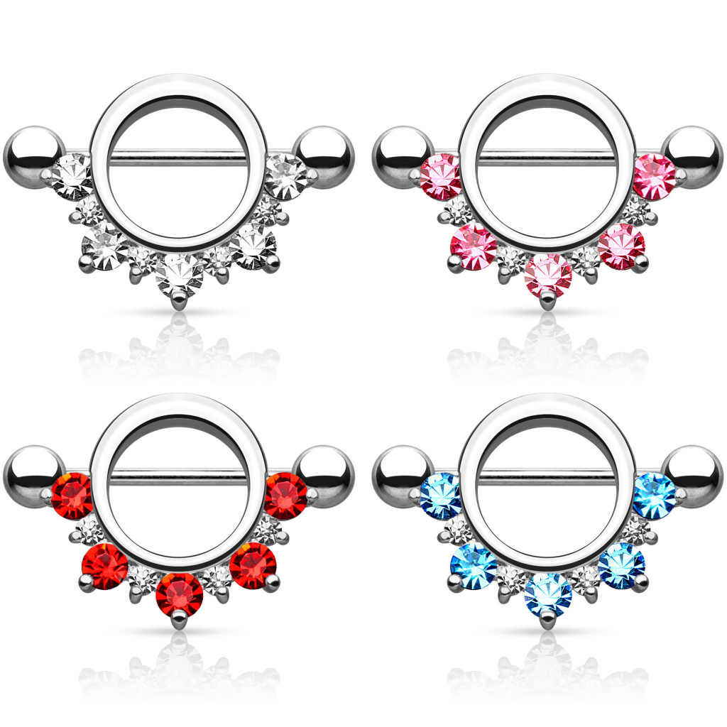 The bottom part features round stones, available in different colors. The arch contains five big gems and five smaller ones, arranged alternatively. The smaller ones are all white, but the bigger ones are available in different colors. You can choose the classic model, in which all the stones are white. But if you want to give your nipple a colorful touch, you can combine white gems with red, pink, or turquoise colors.