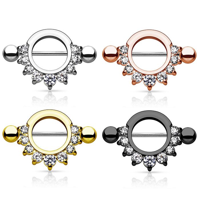 It's about time you pamper your nipple piercing with new beautiful jewelry. This nipple shield includes a straight barbell behind it. In the front, the shield holds nine beautiful stones that create a half-moon on the bottom.