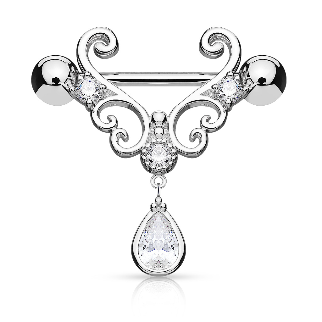 If you think the nipple shield in the picture is beautiful, believe us, it looks irresistible in your nipple piercing. The lovely shape of the shield frames the nipple impressively. It has a total of 4 stones; two on each side, and one in the middle; and the last stone, drop-shaped, hangs from the one in the middle. Besides, the jewelry has a heart and wavy shapes throughout the shield, creating an exceptional nipple barbell.